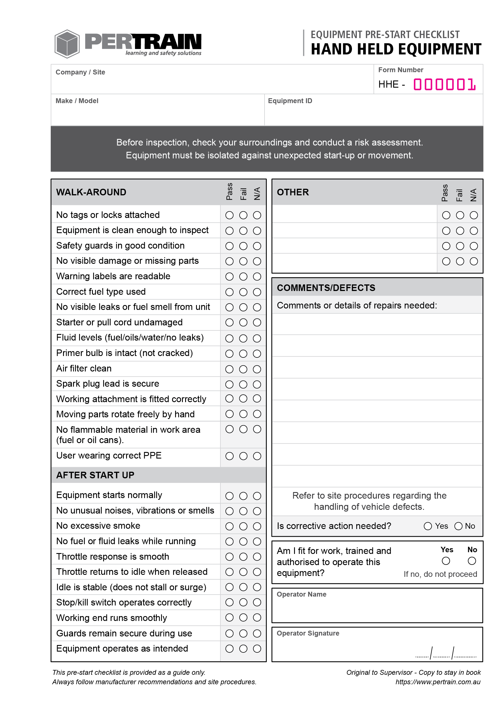 Our Handheld Petrol Equipment Pre-Start Checklist Book is designed by industry professionals to assist machinery owners and operators in meeting their obligations while promoting a safe working environment.